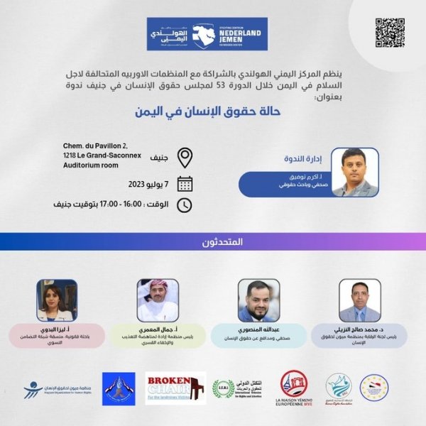 The Yemeni-Dutch Center for the Defense of Rights and Freedoms, in partnership with European organizations allied for peace, organized a seminar on human rights in Yemen. The seminar focused on the violations committed by various parties to the conflict and the challenges faced in the enjoyment of these fundamental rights.